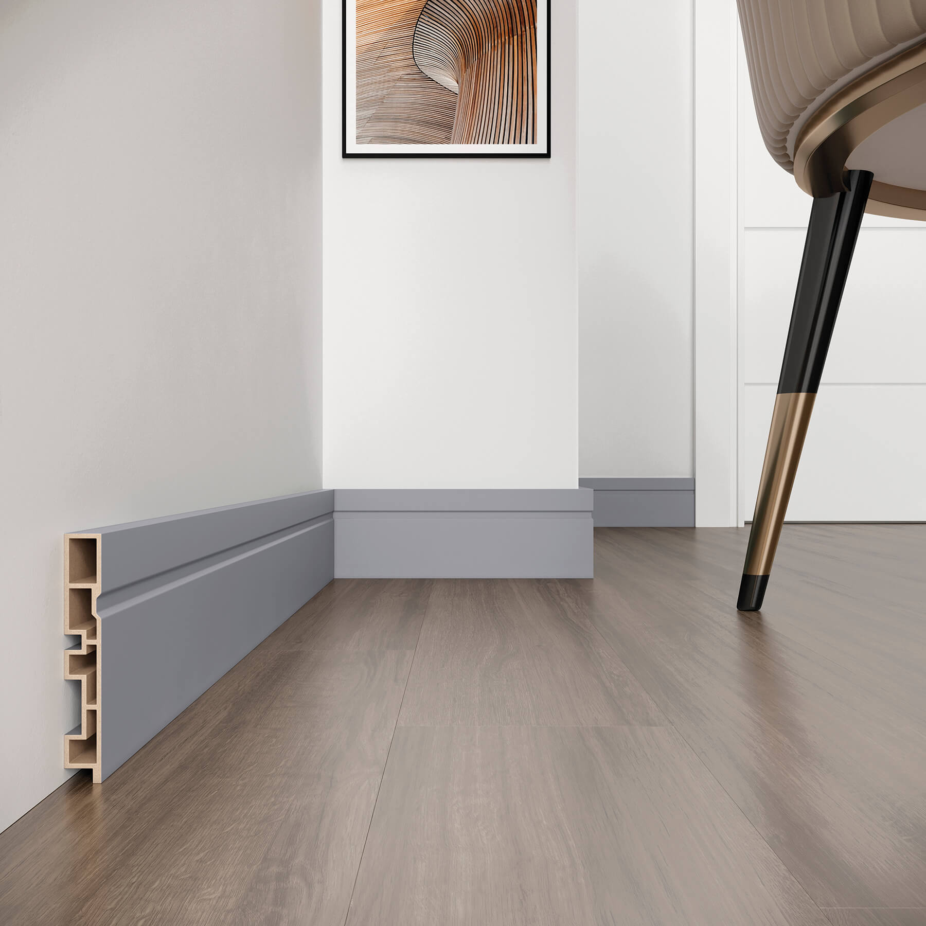 Desenvolvido pela Eucatex, é ecológico, o rodapé possui uma partícula fina de madeira à resina plástica tornando-o resistente e durável. Imune a insetos, é a prova d´água e resistente a criação de mofo e fungos. O rodapé combina com os pisos vinílico e laminados.