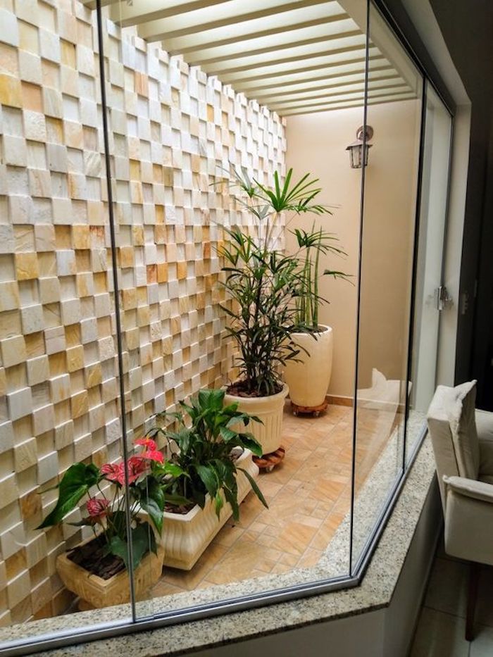 Para complementar, é interessante incluir elementos decorativos como esculturas, fontes pequenas e móveis de apoio. Poltronas de vime ou cadeiras em tons neutros oferecem um espaço agradável para relaxar, enquanto almofadas e tapetes em tons complementares ajudam a integrar o jardim à paleta de cores dos ambientes adjacentes.