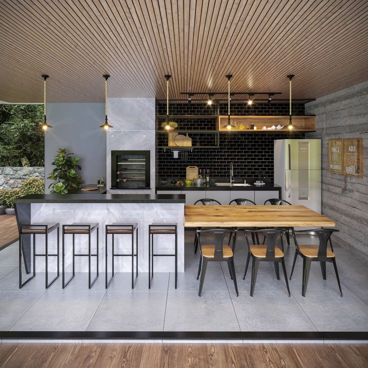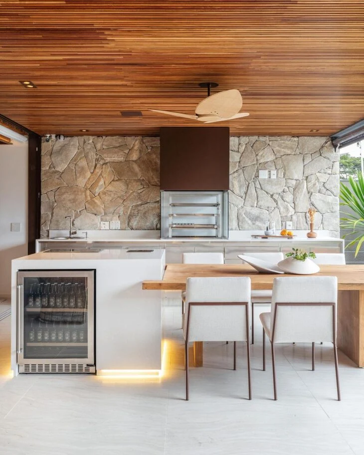 Decoração: O design da área gourmet pode variar conforme o estilo da residência, indo desde o rústico até o moderno. Em ambientes rústicos, materiais como madeira, tijolos à vista e pedras são predominantes, enquanto nas áreas gourmets mais modernas, prevalecem acabamentos de inox, superfícies lisas e linhas minimalistas. A paleta de cores pode seguir desde tons terrosos e neutros até cores mais vibrantes, dependendo da proposta.