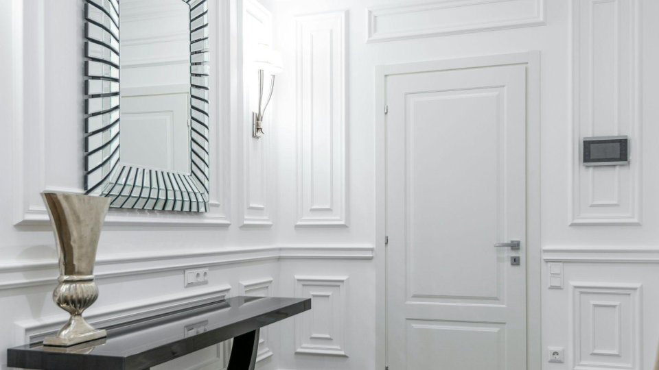 Paredes brancas com detalhes em boiserie (molduras) e rodapés altos e trabalhados, que dão um ar elegante e imponente ao espaço.